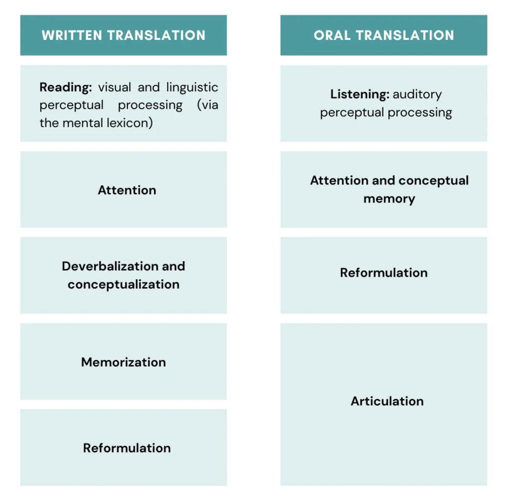 Second, attention and conceptual memorization. Oral translation is characterized by the simultaneous execution of auditory perception, comprehension, and reformulation. This requires vigilant attention and effective memorization, resulting in a high cognitive cost, rapid execution speed, verbal fluency, automatization, and intense verbal auditory processing. The task is to retain the source message, memorizing its deverbalized content over the time span of the speaker’s utterance, which implies conceptualization and the transition from immediate memory to semantic long term memory.