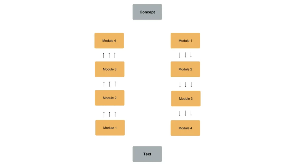 During the decoding phase, perception and comprehension, each level of representation is derived entirely from the immediately lower level in a bottom-up serial procedure. Conversely, during the encoding phase, production or reformulation, each level of representation is derived entirely from the immediately higher level in a top-down serial procedure.